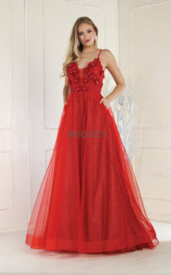 LF 7718 – Shimmer Tulle A-Line Prom Gown with 3D Floral Applique V-Neck Bodice & Open Lace Up Corset Back