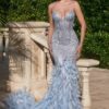 A one-shoulder prom gown with intricate beaded lace, a flattering fit and flare silhouette, a sheer boned corset bodice and shoulder sash, available in black and sage sizes.