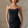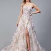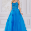 A strapless fit and flare prom gown with a beaded sheer boned corset bodice and lace up corset back, available in black, champagne, emerald, lilac, and pink. Sizes: 2-14 Updated: 9-29.