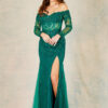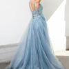 A strapless A-line gown with 3D floral embellishments, crafted in a sheer boned bodice and lace-up corset back. Available in Dusty Rose and Sage Sizes 2-14, suitable for special nights or prom events.