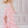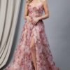 A shimmering tulle gown with a 3D applique bodice, lace-up corset, slit back and leg, available in dusty blue sizes 0-18. Updated: 5-1