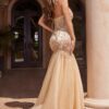 A glitter print prom dress with a V-neck, sheer boned bodice, feathered accented straps, and a bold flare design. Available in Black, Champagne, and Lavender sizes XS-2XL. Updated on: 10-5.