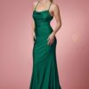 A sleek satin gown with a corset bodice, cowl neckline, fit and flare silhouette, leg slit, lace-up open back, and stretch satin material. Available in Black, Emerald, Red, and Royal Blue Sizes XS-2XL. Updated: 10-4.