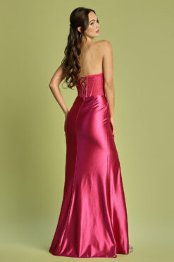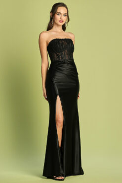 A stunning stretch satin gown with a sheer lace embellished boned corset bodice, leg slit, and lace up back. The fit and flare silhouette flatters your figure, while the stretch satin material allows for comfortable movement.