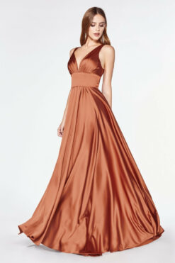 A-Line Satin Prom Gown with Pleated V-Neck Bodice, Spaghetti Straps & Leg Slit. Available in Black, Blush, Burgundy, Dark Mauve, Eggplant, Emerald, Lavender, Mauve, Navy Nude, Paris Blue, Purple, Red, Rose Gold, Royal Blue, Sage, Sienna, Silver and Smoky Blue. Sizes 2-24 Updated: 4-26.