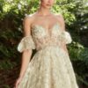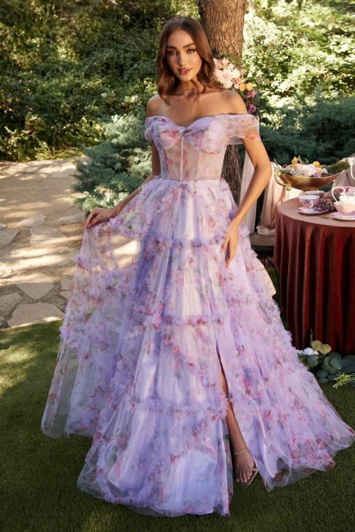 A formal prom gown with an off-the-shoulder floral print A-line design. The sheer corset bodice adds a touch of elegance, while the layered tiered skirt creates a flattering silhouette. Available in Lavender Sizes 2-16 Updated: 1-19
