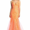 A strapless mermaid gown with a beaded bodice and glitter layered tulle skirt. The corset lace up back adds style and functionality, offering a perfect fit. Available in Red Size 2-12. Updated: 11-5.