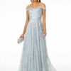 A glitter print A-line prom gown with a ruched V-neck bodice and leg slit, available in gold mist and gold mocha. Sizes 10-22 updated: 10-16.