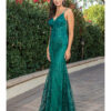 A fit and flare formal gown with a one-sleeve design, glitter patterned leg slit, and a lace-up back. Feather accents add a unique touch. Available in Champagne and Emerald sizes (6-14) – Updated: 9-27.