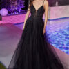A stunning prom gown featuring intricate beading and a sheer boned corset bodice, accentuated by a lace-up corset back. The mermaid silhouette flatters every curve, and the feather detailed skirt adds a touch of elegance. Let this gown make a statement at your next event.
