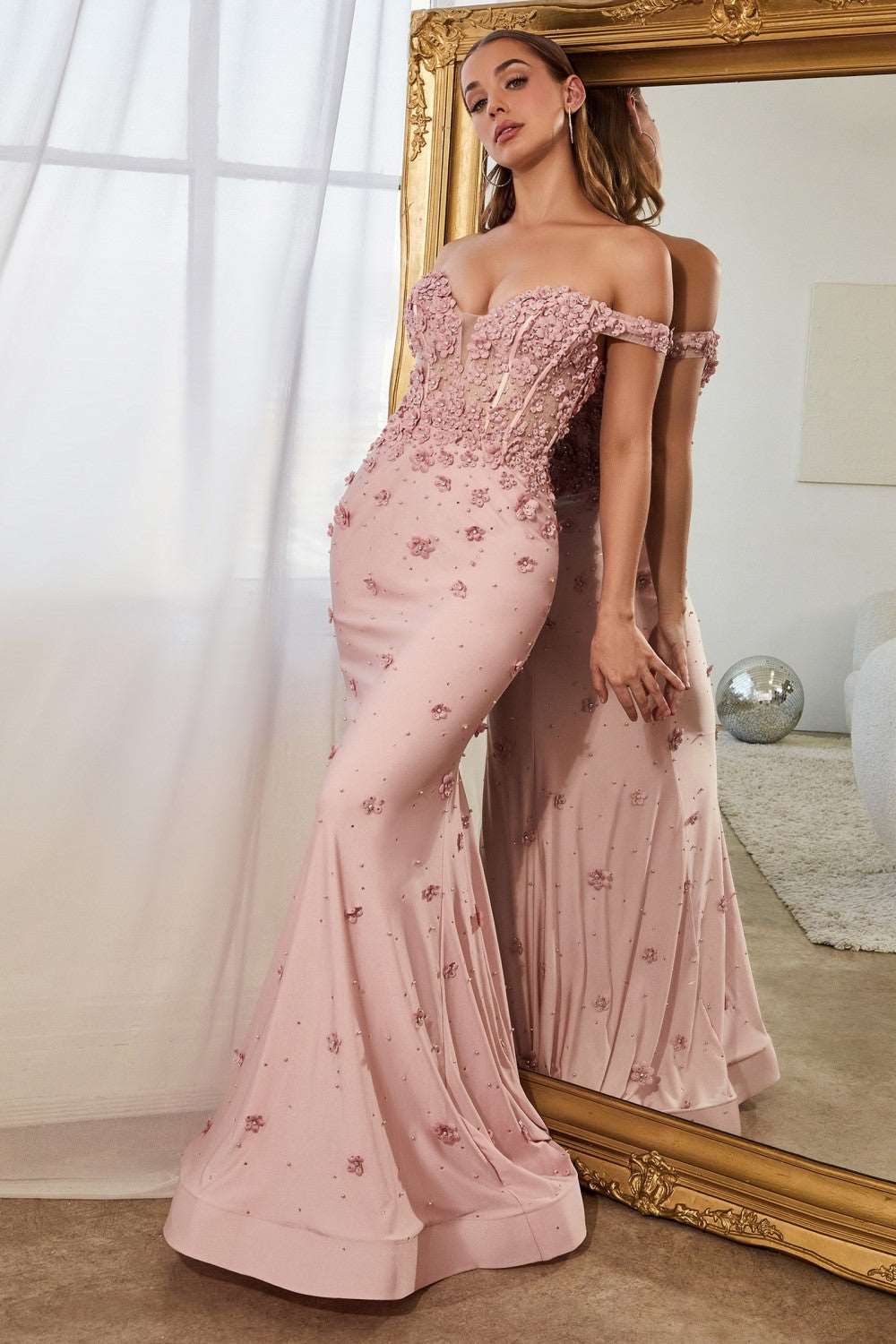A 3D Floral Mermaid Prom Gown with Sheer Boned V-Neck Bodice, available in Blue, Dusty Rose and Red Sizes 2-14. Updated: 9-15.