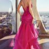 A strapless prom gown with a sheer corset bodice and layered tulle A-line skirt. The high leg slit adds a stunning entrance while maintaining a classic silhouette. Available in Amethyst, Black, Emerald, Lt Blue, Mocha Gold, Red, Rose Gold, Sage and Smoky Blue sizes 2-18. Updated: 11-5