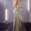 A shimmery fit and flare prom gown with a boned corset bodice and cowl neck open lace up back and leg slit. Spaghetti straps can be removed. Available in Black, Champagne, Emerald, Lavender, Navy, Red, Rosewood, Royal Blue, Silver and Smoky Blue sizes 18-24. Updated: 8-3.