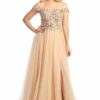A full sequin scoop neck fit and flare prom gown with cut-out sides, strappy open back and leg slit. Available in lavender and ocean-blue sizes 2-6. Updated: 8-9.