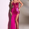 A shimmering stretch fabric prom gown with a boned corset bodice adorned with hot stones, offering a flattering and dramatic fit. The high leg slit adds a subtle flair.