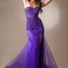A stunning prom gown with a strapless plunging V-neckline, full sequin fit & flare silhouette, feather accents, a high leg slit and lace-up corset back. Available in Black and Lavender sizes XS-3XL.