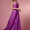A glitter embossed gown with a scoop neck design, available in black, rose gold, and silver. Sizes: 6-10