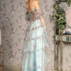 Strapless Glitter Print Fit & Flare Prom Gown with Sheer Boned Bodice & Removeable Puff Sleeves. Available in Black/Gold and Lapis Blue. Sizes 6-12 Updated: 8-9