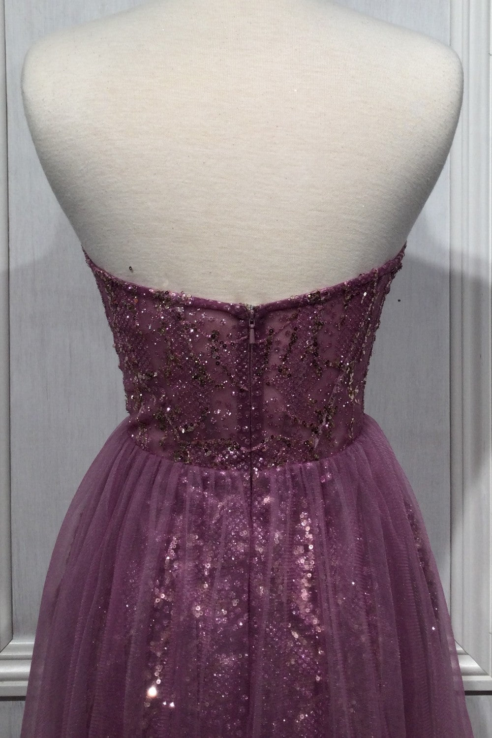 Strapless Embellished Fit & Flare Prom Gown with Sheer Boned Corset Bodice & Tulle Overskirt. Available in Amethyst Sizes 2-16 Updated: 8-17
