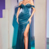 A stretch satin gown with a flare and lace-up bodice, featuring faux button accents, available in black sizes 6-16 and updated 9-11.