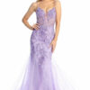 Strapless Fit & Flare Prom Gown with Sequin Butterfly Print Sheer Boned Bodice Leg Slit & Detachable Side Sash. Available in Lavender and Naples-Yellow Sizes: 4-6 Updated: 8-7