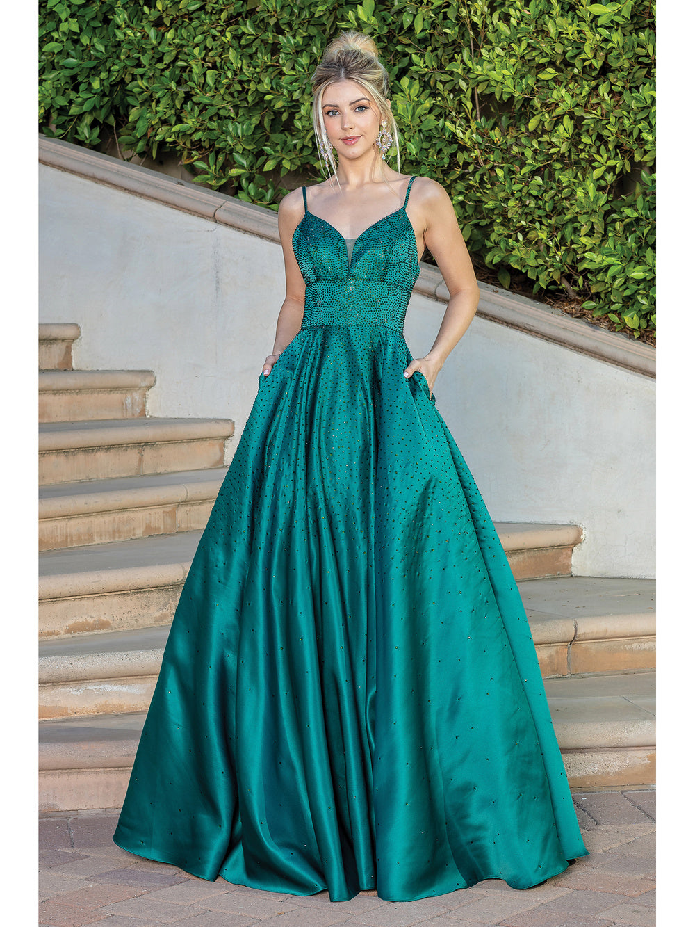 Rhinestone Accented Satin A-Line Ball Gown with Plunging V-Neck Bodice Wide Banded Waist Pockets & Open Corset Back. Available in Bahama Blue, Burgundy, Hunter Green and Navy. Sizes XS-3XL Updated: 3-27