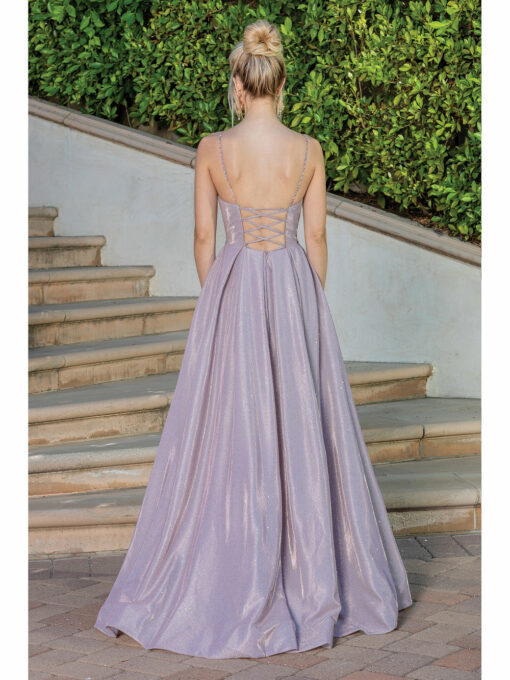 Iridescent Metallic A-Line Prom Gown with Gathered V-Neck Bodice Lace Up Corset Back & Leg Slit. Available in Blue, Gold and Rose Gold. Sizes: XS-3XL Updated: 3-26.