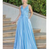 A line prom gown with sheer fabric and 3D applique bodice made of printed organza, available in pink and yellow sizes XS-3XL. Updated: 2-18.