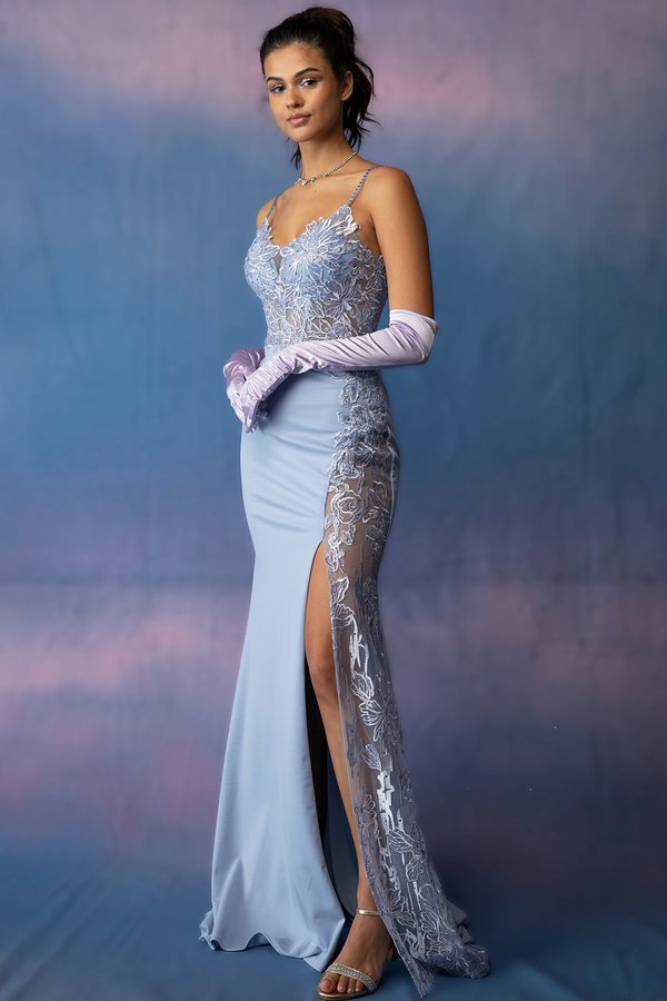Stretch Jersey Fit & Flare Prom Gown with Sheer Sequin Embellished Floral Lace Bodice Plus Side Panel & Leg Slit. Available in Peri Blue, Red, Black and Emerald Green Sizes XS-3XL Updated: 11-14