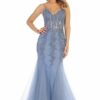 A glitter print gown with a V-neck design, featuring a rhinestone belt and tulle insert, suitable for both XS to 3XL sizes. Updated: 3-17.