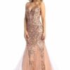 A full sequin off-the-shoulder gown with a flare prom style, featuring sheer beaded lace bodice, leg slit, and an open corset back. Available in green, navy, and rose gold, sizes XS-3XL, updated for 2-2.