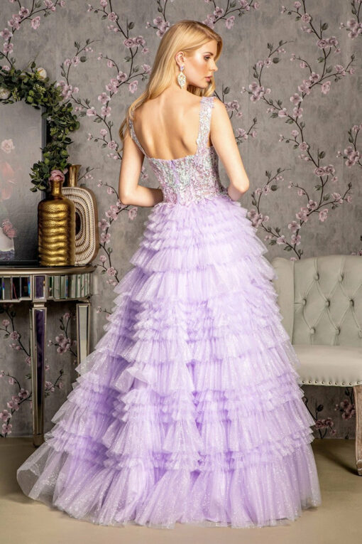 A glitter tulle A-line ball gown with a sheer embroidered boned corset bodice and layered ruffle skirt, available in Lilac Sizes XS-3XL. Updated: 1-26.