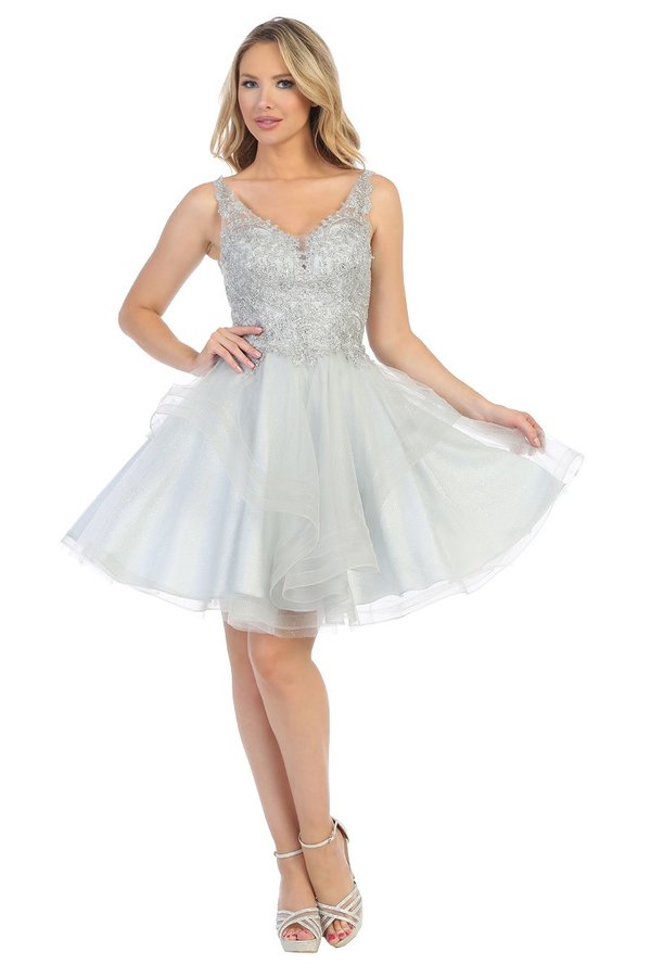 LF 6220 – Glittery Homecoming Dress with V-Neck Lace Applique & Layered Tulle Skirt
