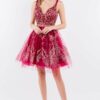 A long sleeve, off-the-shoulder homecoming dress with embroidered bodice and corset back. Available in ivory and champagne sizes XS-3XL, 3-18.
