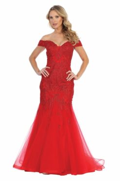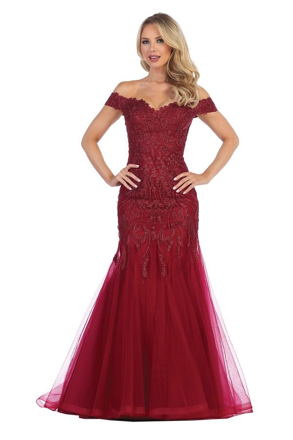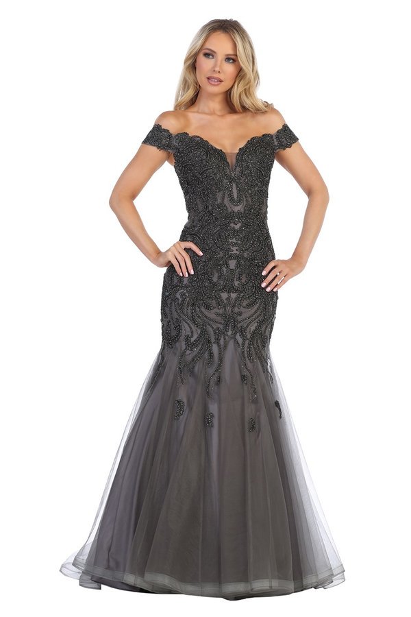 A flattering, flare-promoted off-the-shoulder prom gown with beaded applique, available in champagne, burgundy, charcoal, red, and black. Sizes XS-L Updated: 3-18.