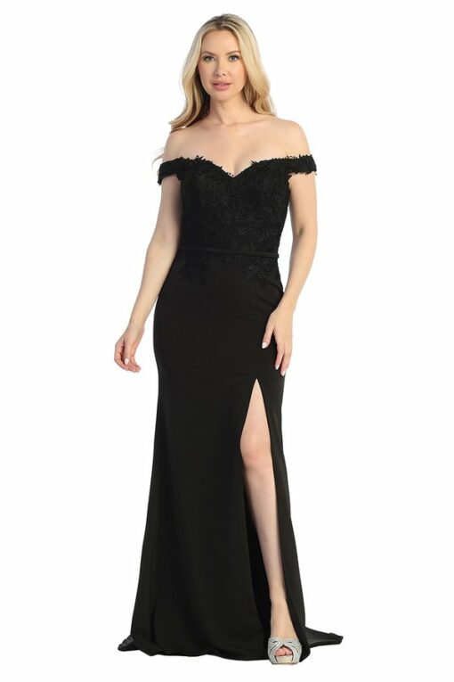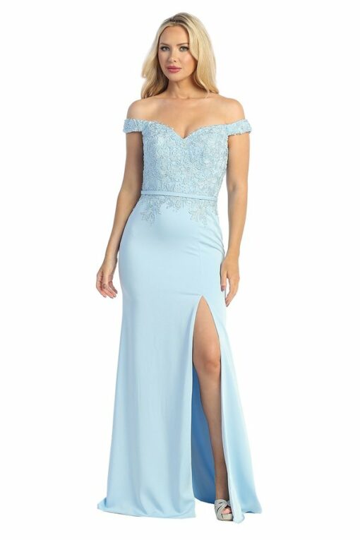 Style Number: 7565 Off the Shoulder Fit & Flare Prom Gown with Lace Applique Bodice Leg Slit & Sheer Lace Inset Train. Available in Blush, Burgundy, Lavender, Off White, Red, Black, Baby Blue and Royal Blue. Sizes XS-3XL 3-18