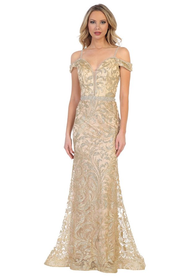 This stunning LF 7639 prom gown features a glitter-patterned fit and flare design, accentuated by an elegant off-the-shoulder neckline. The illusion V-neck adds a touch of sophistication, while the rhinestone belt and straps complete the look with a touch of sparkle. Elevate your prom night with this glamorous and stylish dress. Available in Champagne, Charcoal & Rose Gold. Sizes XS-3X Updated: 3-17