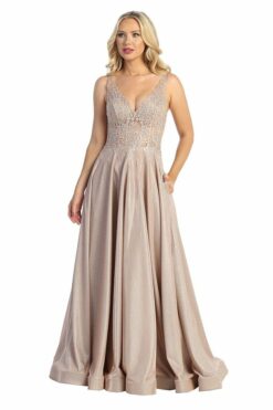 Elevate your prom look with the LF 7708 gown. The metallic A-line design and lace embellished sheer boned bodice create a stunning silhouette. Plus, with pockets, you can easily carry your essentials.