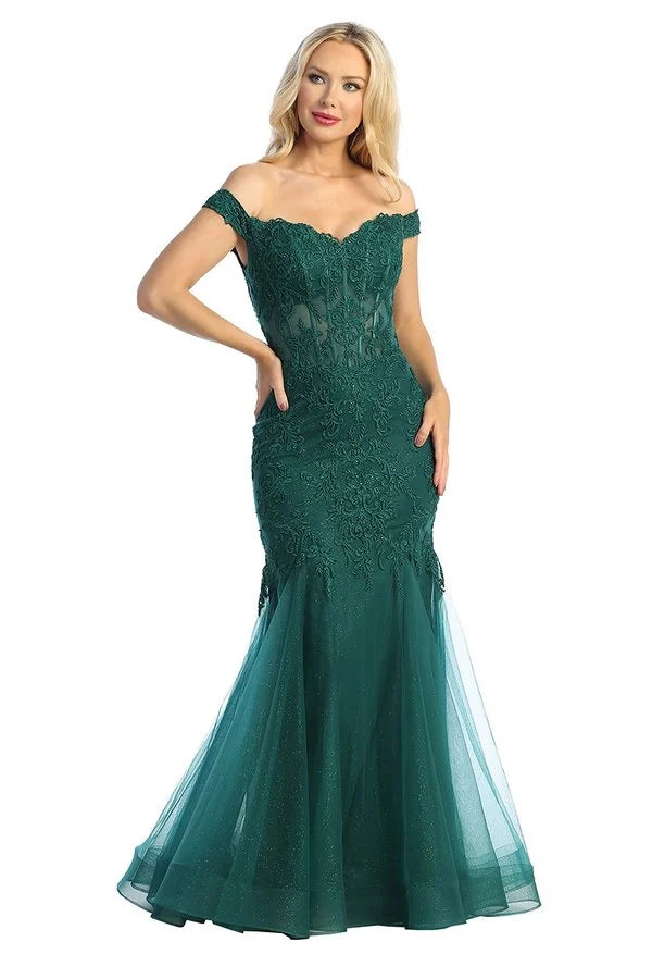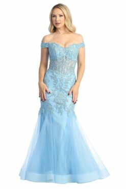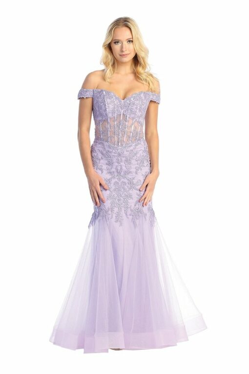 A Prom gown with a flattering off-the-shoulder design, featuring sheer boned lace applique bodice and shimmer tulle skirt. Available in Slate Blue, Burgundy, Lavender, Off White, Sky Blue and Teal. Sizes XS-3XL Updated: 3-18.