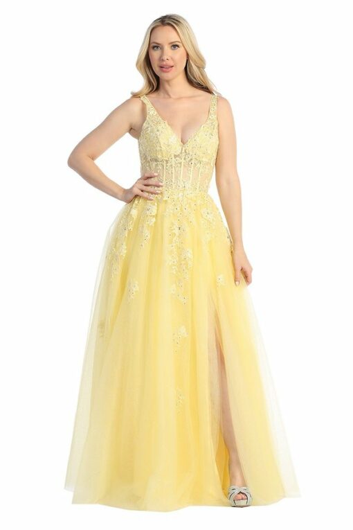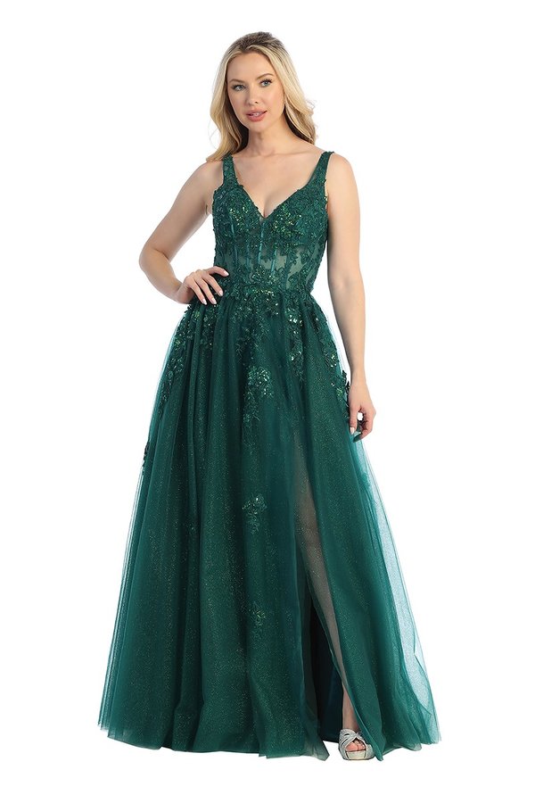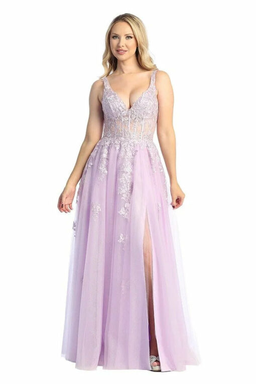 A stunning prom gown featuring shimmer tulle, 3D floral applique, and a sheer boned bodice. The A-line silhouette flatters all body types, with a leg slit for an alluring touch. Available in Lilac, Emerald, Off White, Sky Blue, Slate Blue, Teal, and Yellow sizes XS-3XL. Updated: 3-19.