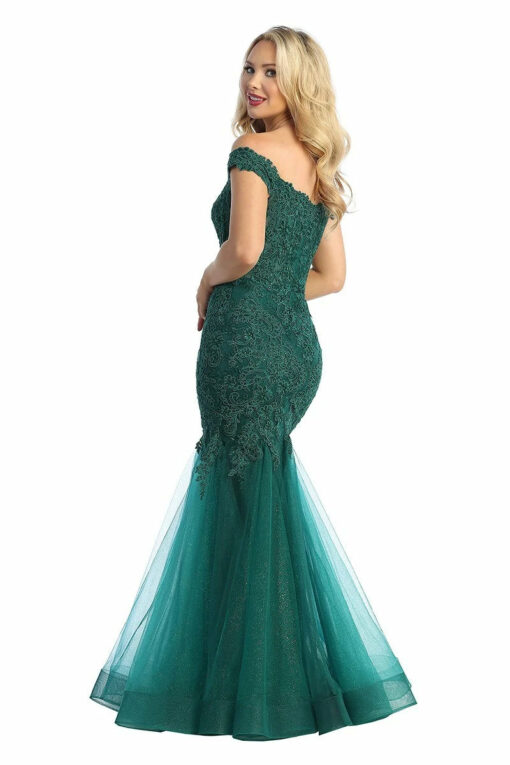 A stunning prom gown with an off-shoulder neckline and a sheer beaded lace corset bodice, featuring elegant embellishments. Available in Emerald, Teal, Slate Blue, Black, Red and Burgundy sizes XS-3XL.