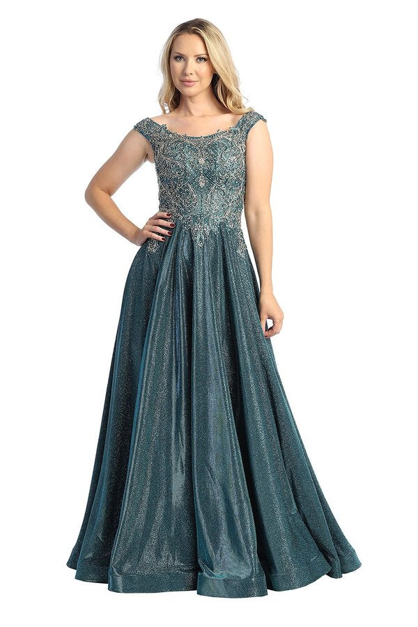 A line prom gown with off-the-shoulder A-line silhouette and embroidered bodice, perfect for formal events. Available in Champagne, Rose Gold, and Teal. Sizes XS-4XL Updated: 3-18