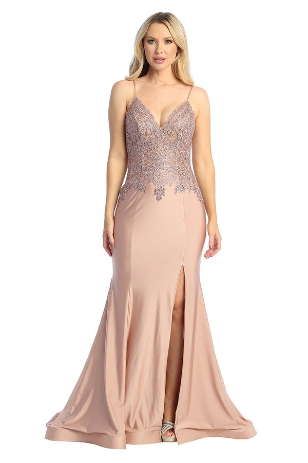 A stretch satin gown with a flare design, featuring sheer beads and lace embellishments. Available in Dusty Blue, Black, Mauve, Red, and Gold. Sizes XS-4XL Updated: 3-18.