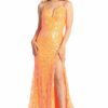 A show-stopping prom gown with a fitted silhouette featuring full sequins, a sheer lace leg panel, and a strappy back. Available in Black, Orange, and Royal Blue Sizes XS-2XL. Updated: 3-19