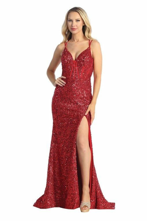 Dazzle and stand out in our LF 7844 sequin prom gown. The fitted bodice with boning provides support while the leg slit and strappy open back add a touch of playfulness. Perfect for any formal event, this gown will flatter your figure and make you the center of attention.