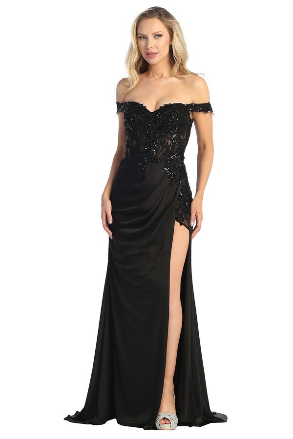 A flattering off-the-shoulder prom gown with a sheer beaded boned corset bodice and leg slit, available in Black, Emerald, Mauve, Red, and Slate Blue sizes XS-3XL. Updated: 3-18