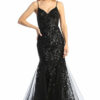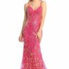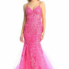 A stunning sequin patterned fit and flare prom gown with a sheer boned corset bodice and open lace up back. Available in Hot Pink Sizes XS-2XL.