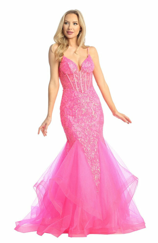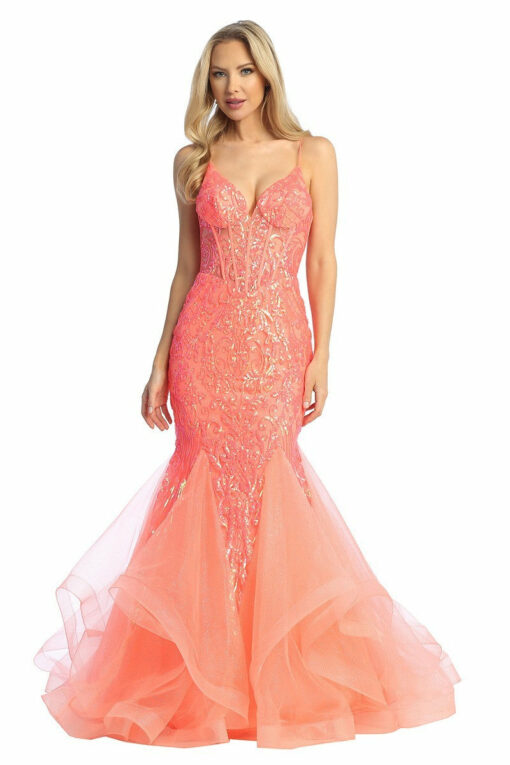 Step into the spotlight with our LF 7878 prom gown. The sequin embellished fit & flare design accentuates your curves, while the sheer boned corset bodice provides support and structure. The tulle skirt adds a touch of elegance, making it the perfect choice for your prom night. Available in Orange, Fuchsia and Lavender Sizes XS-3XL Updated: 4-7