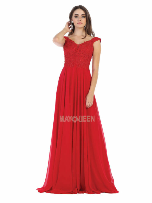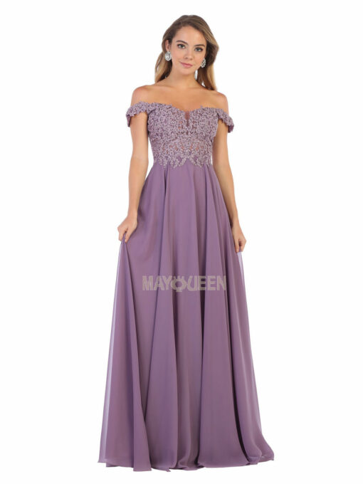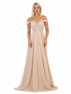 A line prom gown with sheer lace embroidery on a corset and flowy chiffon skirt, available in blush, burgundy, champagne, dusty blue, dusty rose, eggplant, ivory, mauve, navy, red, royal blue, sage, silver and viking lilac. Sizes 2-26 Updated: 10-17