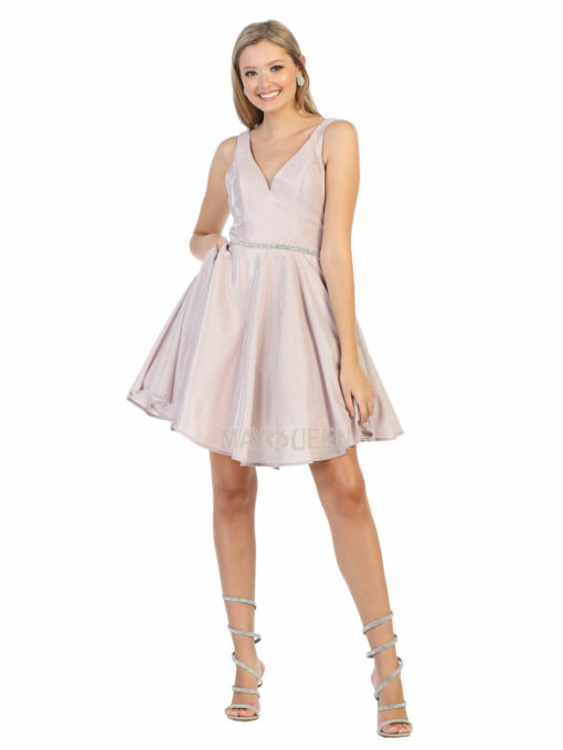 Metallic Tank Style A-Line Homecoming Dress with Beaded Belt & Pockets. Available In Baby Blue, Champagne, Ivory, Rose Gold, Royal Blue, and Pink. Sizes 2-20 Updated: 10-16